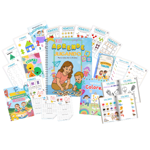 El Kit Aprende Jugando está diseñado para que tu peque (de 1 a 4 años) descubra colores, letras, números, formas y mucho más, jugando desde casa con actividades imprimibles, listas en segundos y sin necesidad de pantallas.